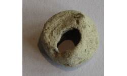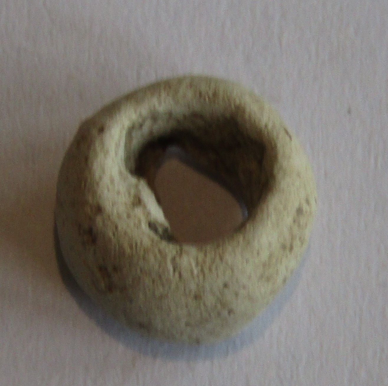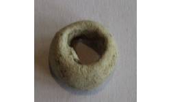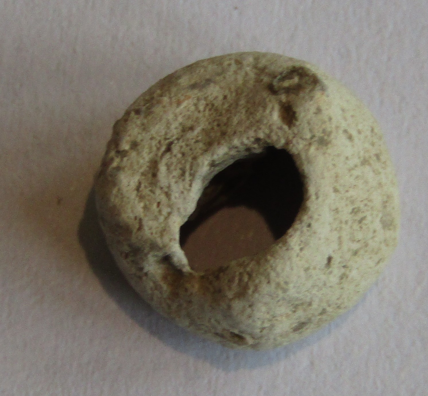 Object Desc Made out of some soft white stone (possibly some form of chalk) the middle has been roughly chisled out to create this bead. It was on its own no others were found
